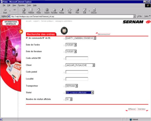 Extranet Le secteur du transport est en plein bouleversement avec l'arrivée de nouveaux outils technologique. Ces nouvelles technologie, basées autour des portails mobiles, d'Internet, sont également des sources de productivité et de qualité pour les entreprises. Dans ce nouveau contexte j'ai développé pour le groupe SERNAM et la société SPEED+ une application de suivi des colis. Cette solution permet aux clients donneurs d'ordres de suivre les expéditions en temps réel via Internet. L'expéditeur a accès au site via un password. Le site affiche dans le détail les opérations de livraison avec son statut et sa datation :
